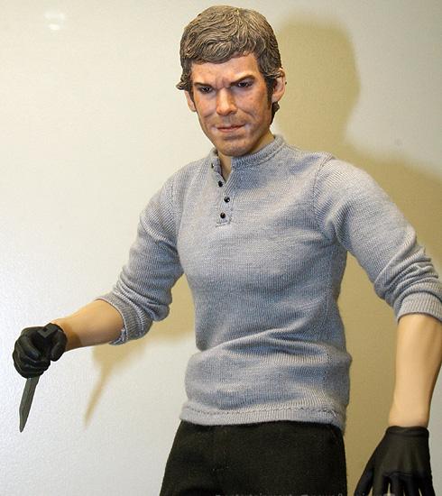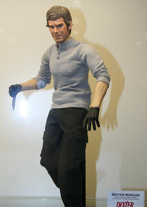 Последнее, что было представлено на выставке, это 12-дюймовая пластиковая модель Декстера на 38-ми шарнирах. Вся одежда выполнена из настоящих материалов, впрочем, как и нож. Лезвие металлическое и при желании вы можете его наточить. Детали ещё находятся на доработке и вместе с фигуркой возможно появится коробка с образцами крови, мясницкий фартук и сумка с "инструментами". Статуэтка выйдет на рынок в июне-июле по предположительной цене 90$.